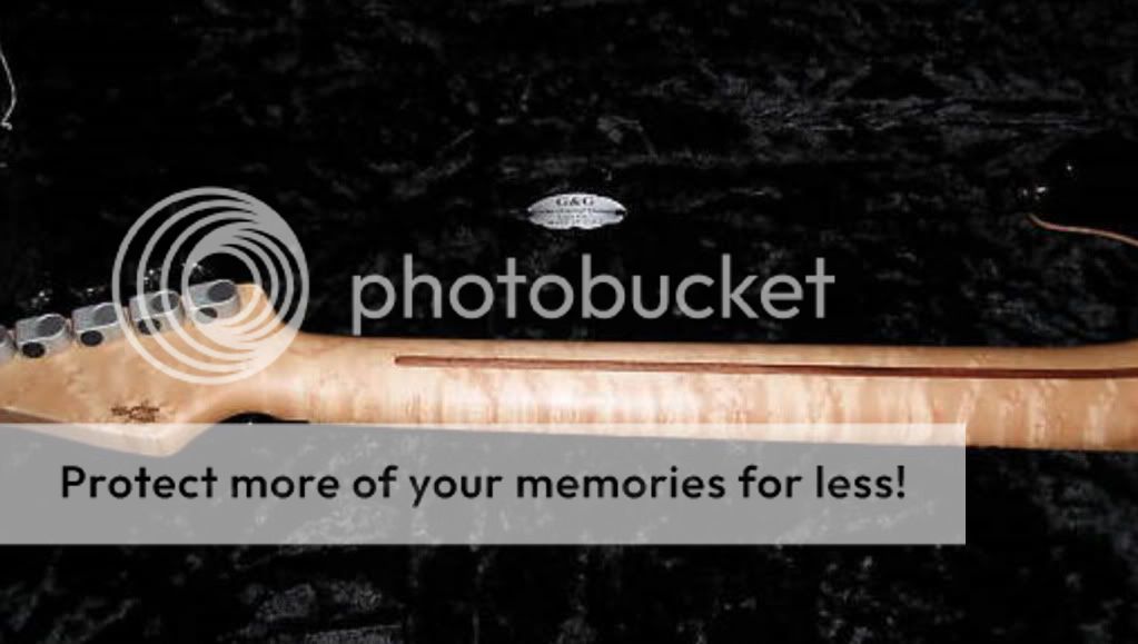 sur la purple un seul potard de volume sans tone et il s'agit d'un manche erable birds eyes museum avec une tete normale des mecanique spertzel non autoblocante et le logo peint or et donc l'acastillage complet chromé et des repere de touche noir et un magnifique binding sur le corps