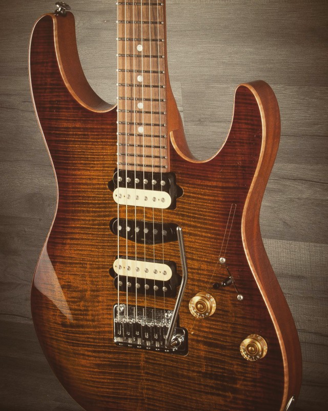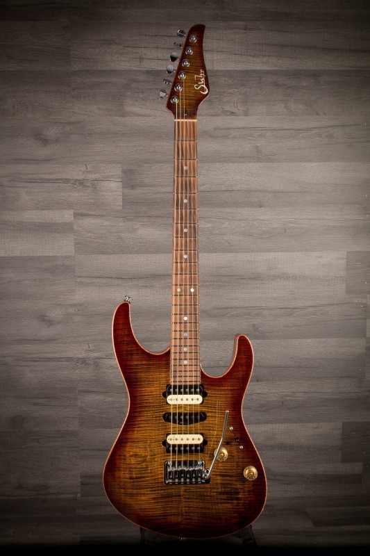 Pour les specs c'est corps acajou, table érable, manche acajou touche en pao ferro, pour les micros on a la config classique H-s-h suhr SSH+ ML SSV, split du manche sur le tone, câblage GG et blower switch.