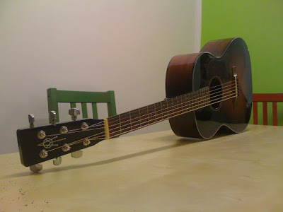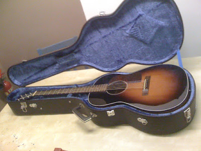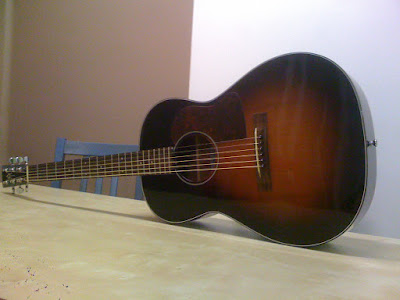 C'est un format 00, inspiré de la Gibson L1 il me semble, table épicéa, dos et éclisses en acajou laminé, finition sunburst.