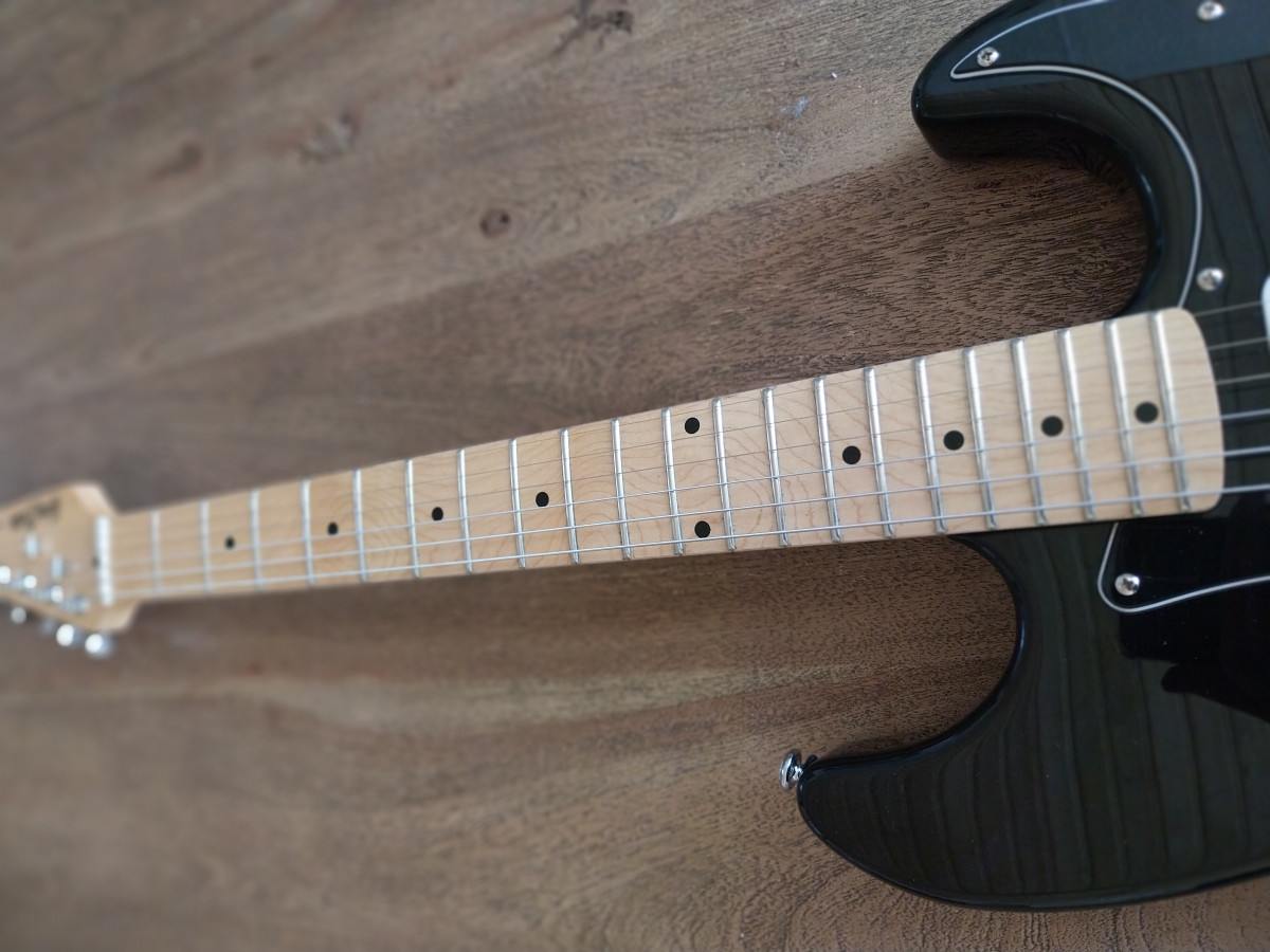 Une bonne poignée d'heures plus tard, le truc qui me choque depuis le début est ce vernis mat sur l'érable du manche. Comme celui-ci est sur l'établi, je décide de le poncer entièrement pour lui appliquer 3 couches de vernis brillant.