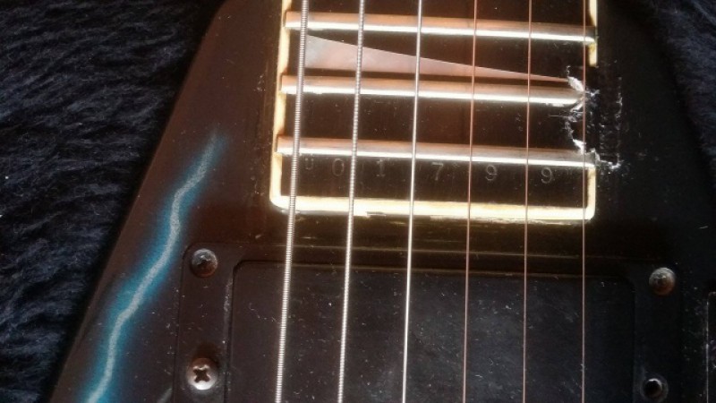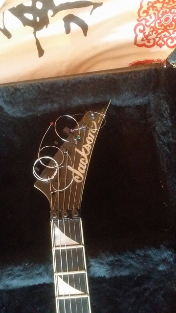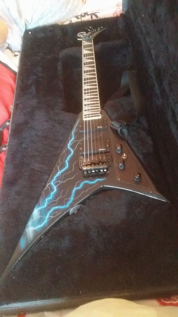 Jackson Randy Rhoads USA Custom Shop Lightning Sky de 1992 , donc fait à la main et sur mesure que j'aimerai rénover au mieux afin d'atténuer l'usure du temps. Cette guitare fut volée pendant prêt de 6 ans avant d'être miraculeusement retrouvée par son propriétaire original (mon père).