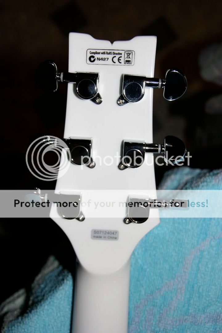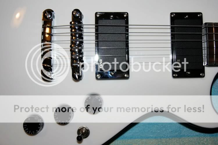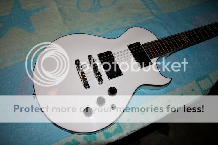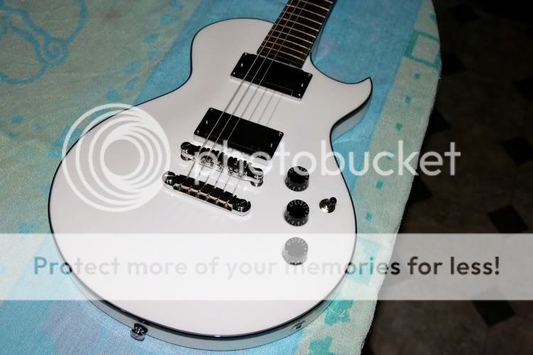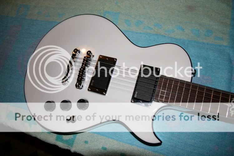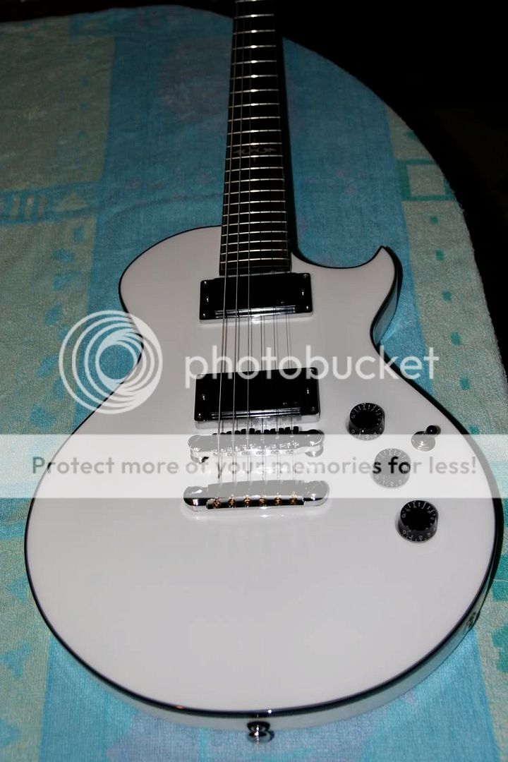 Coups de coeur aujourd'hui, je cherchais une gratte dans l'esprit Lespaul pour jouer du metal. Mes critères étaient couleur blanche, micro EMG et bois Acajou au minimum (EMG+Acajou est un très bon mariage en matière de son agressif).