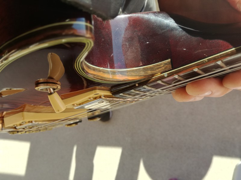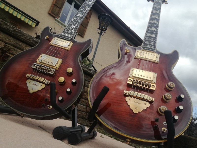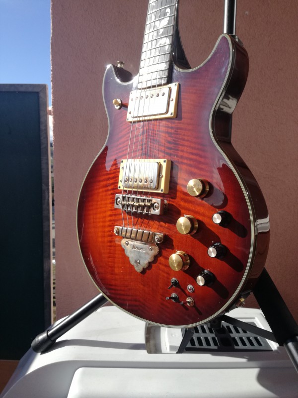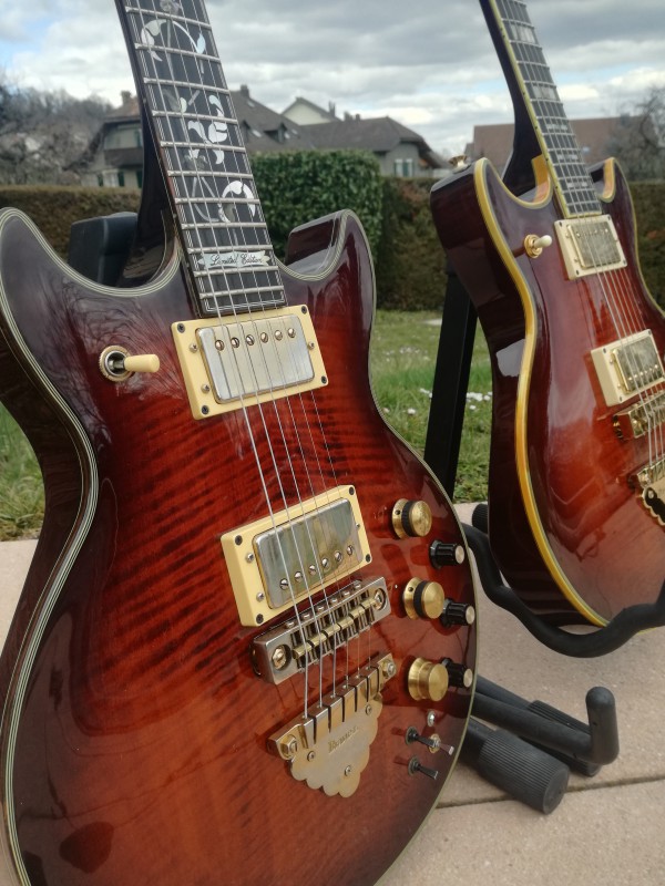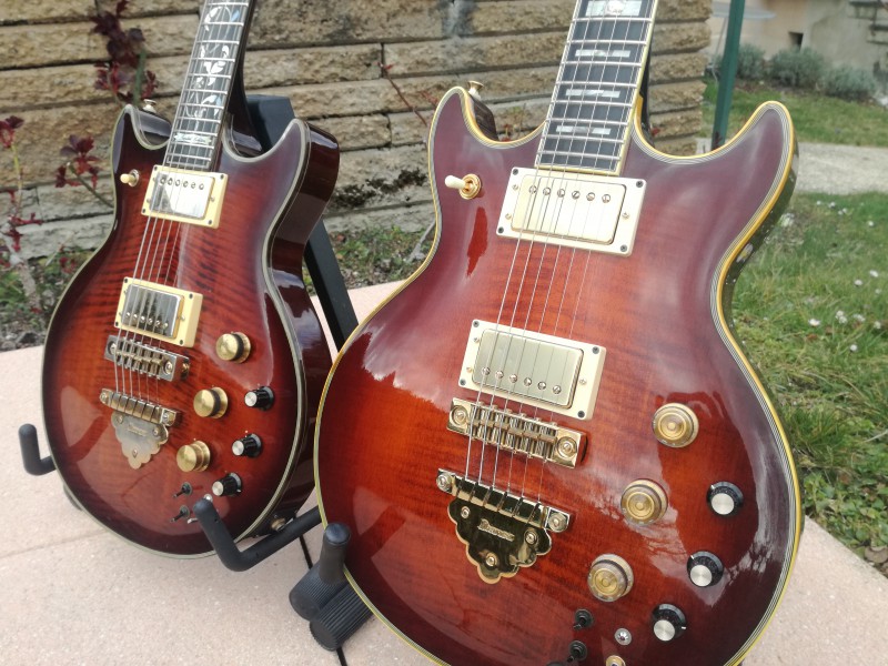 1980–1982: Mahogany w/ 2-piece bookmatched curly/flame/tiger maple top & creme binding