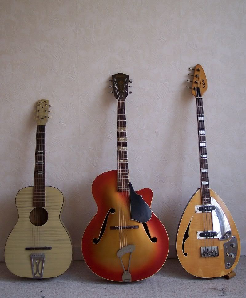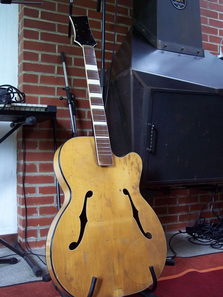 Au premier coup d'oeil et malgré une couche de crasse invraisemblable, j'ai tout de suite pensé à un modèle allemand des fifties (les repères de manche, la tête, le cordier, la frette zéro) mais elle n'a aucun signe distinctif (même à l'intérieur de la caisse).