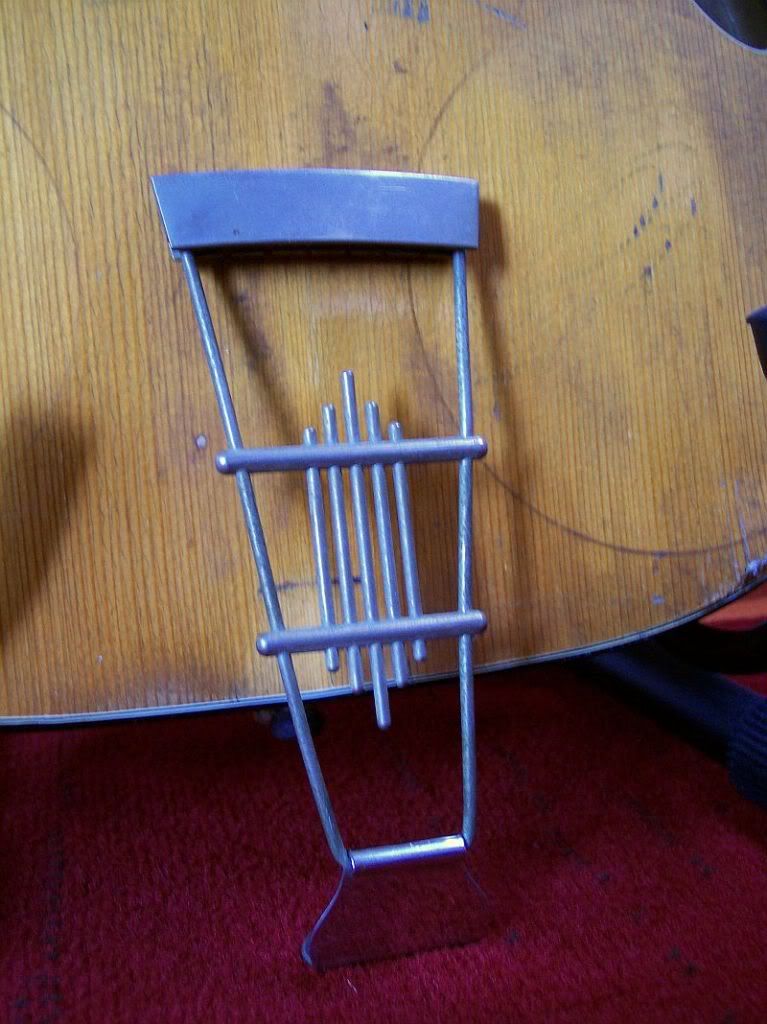 Mes recherches sur le net n'ont rien donné, en particulier auprès des "usual suspects": rien chez Framus, Hoyer, Hopf et autres marques de l'époque. A priori, c'est un modèle cheap, comme l'indique les repères très grossiers sur le manche ou le cordier peu ornementé. Il y'a bien une marque ronde en haut d ela tête, mais pas moyen de trouver une marque qui aurait eu un écusson rond.