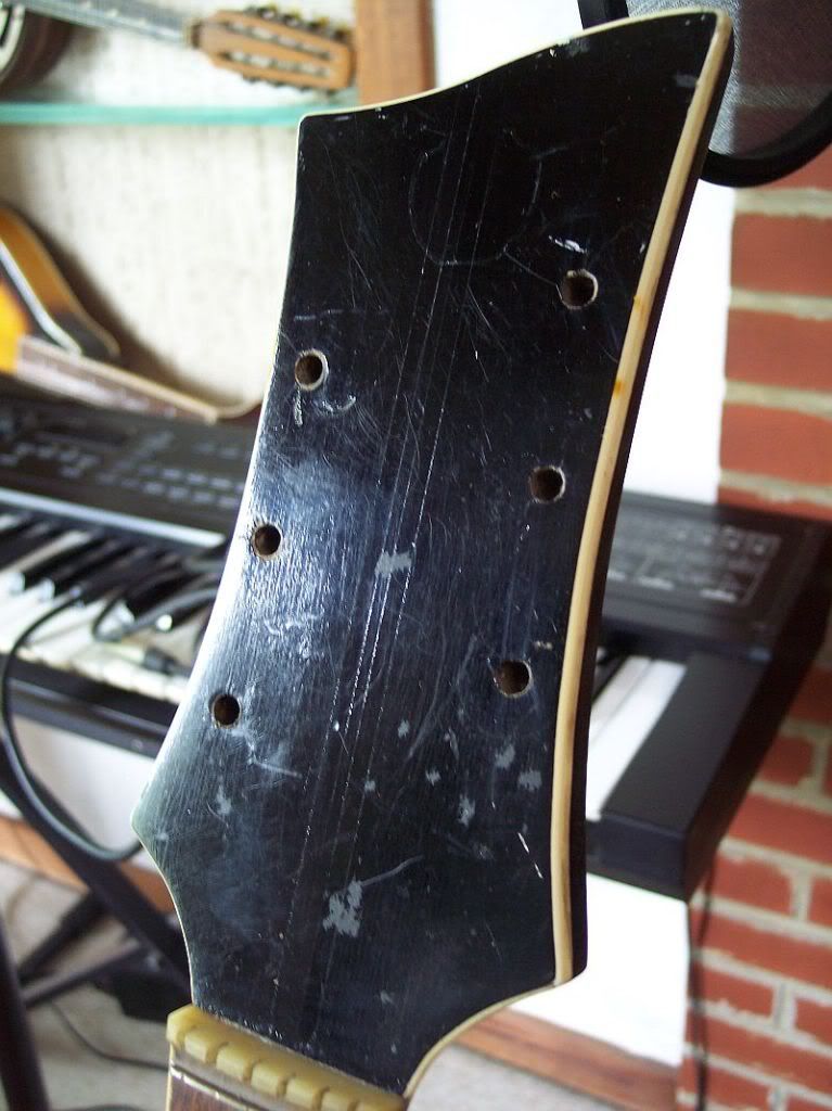 ), j'ai déjà repoli les frettes (+/- ok à part un petit coup sur deux d'entre elles), je vais commander un nouveau bridge et des mécas (celles d'origine sont inutilisables) chez Stewmac (ça coûte une misère). Ah oui: il n'y a pas de trussrod (mais le manche à l'air correct, on verra sous tension).