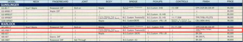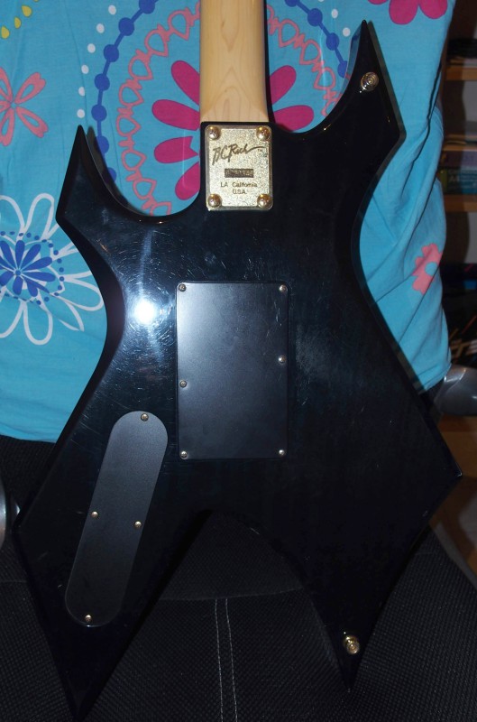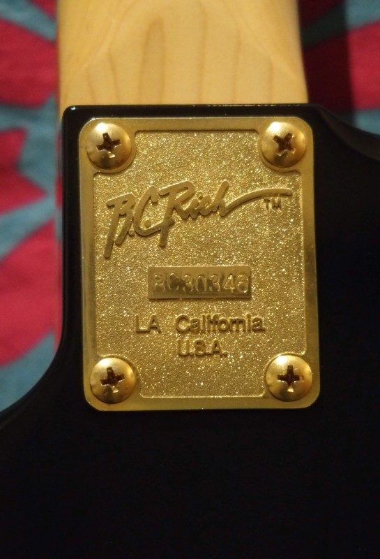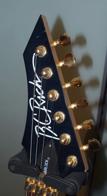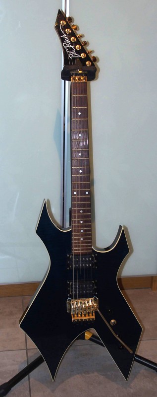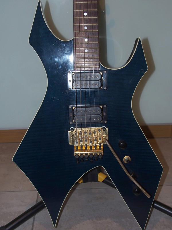 Pour la petite histoire j'avais repéré un modèle de Warlock qui me plaisait bien dans la vitrine du magasin mais naturellement le jour ou je me suis décidé a concrétiser la chose le modèle en question avait été vendu. Par contre le revendeur B.C.Rich se trouvait justement dans la boutique à ce moment là. Il m'a dit qu'il ne lui restait plus que deux modèles d'une même série qui avaient toute deux une couleur laissant voir le bois de la table en érable par transparence : Une noire et une bleue à 6500 Fr pièce (1000 €). Après négociation j'ai choisi la noire pour 5000 Fr (750 €) et lors de la livraison en magasin j'ai bien entendu reçu ... la bleue !