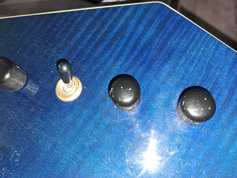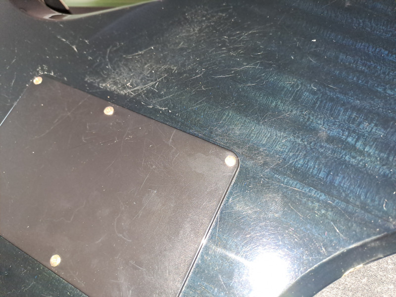 Je n'étais finalement pas déçu car le bleu était vraiment sombre et le bois visible par transparence vraiment très chouette. Par contre j'ai été un peu déconcerté par le liseret(binding) blanc tout autour de la table. Ca donnait à la guitare un aspect somme toute moins metal (ma musique de prédilection de l'époque) et j'étais habitué au look des Warlock de Max Cavalera !