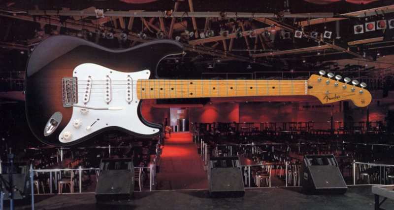 Voilà une photo du catalogue Fender de 1982, on voit bien que la découpe de l'avant bras qui prend une bonne longueur sur la tranche supérieure du corps.