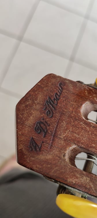 De ce que j'ai trouvé en fouillant, il s'agirait d'une parlor Di Mauro (Antoine), mais je n'en suis pas sûre, les guitares de ce luthier les plus connues étant les guitares jazz, je ne trouve que peu d'informations sur la parlor et autres modèles et ne m'y connais moi même que très peu. Tout ce dont ma grand-mère se souvient c'est qu'on lui ait dit que c'était une guitare "manouche". Elle avait déjà amené la guitare dans un magasin spécialisé en instruments qui n'existe plus aujourd'hui et elle ne se souvient plus de ce que la personne lui avait dit excepté qu'elle pouvait peut-être valoir une petite somme.