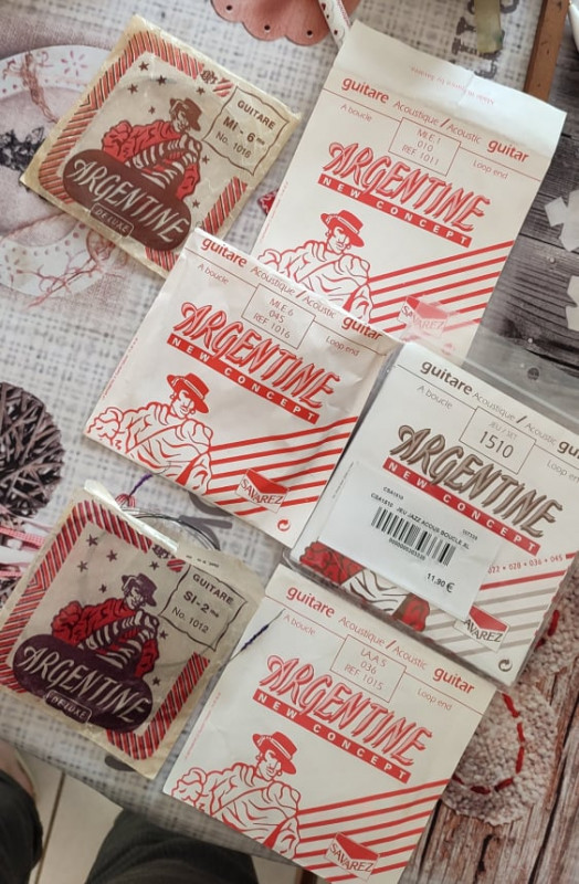En dehors des rayures (malheureusement relativement nombreuses), elle est en bon état général malgré n'avoir jamais été revernie ou autre à notre connaissance et ne manque de rien pour fonctionner parfaitement. Les cordes ont été changées récemment avec la même marque qu'originellement (Argentine). Et comme vous pouvez le voir l'inscription A. Di Mauro a été coupée et il manque le o. Il y a également une inscription du, nous pensons, revendeur de la guitare (l'inscription est abimée mais il semble y avoir écrit "Drouat Bordeaux", avec grande incertitude sur le Drouat).