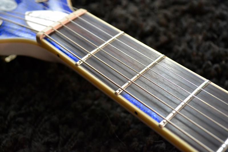 Mon modèle étant un B-stock, je ne pourrai que peu juger les finitions de la guitare car elle possède 3 défauts de binding au niveau du manche. Le reste est très bien réalisé et ne souffre d’aucun aspect cheap ou « bontampis », au contraire, le Sparkle, double binding, blanc au dos de la guitare et pickguard exotique sont fort bien réalisé et j’avoue que c’est une config un peu plus complexe à mettre en oeuvre qu’une finition traditionnelle – Beau travail !