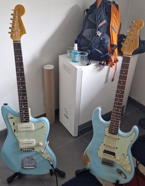 J'ai enfin fini ma Jazzmaster et j'ai récupéré de chez le luthier ma bonne vieille Strat pour une planimétrie (elle en avait bien besoin).