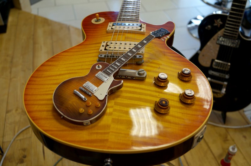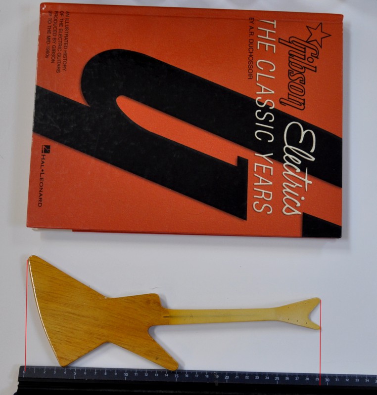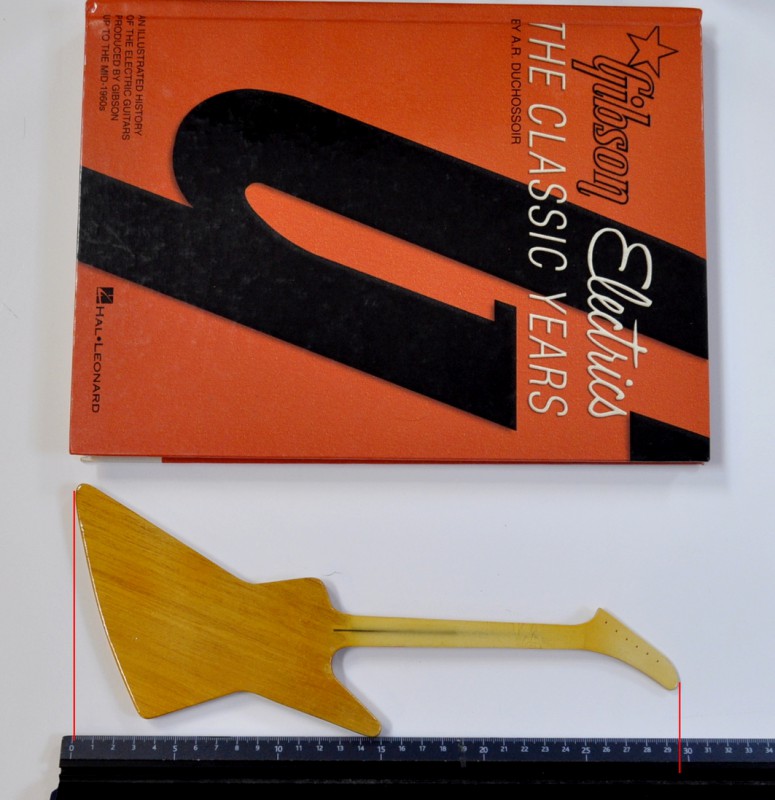 Je commence par une mise en bouche avec les corps des 5 guitares.... A droite une règle qui permet de bien voir les dimensions et à gauche mon premier livre sur Gibson que j'ai acheté à sa sortie.