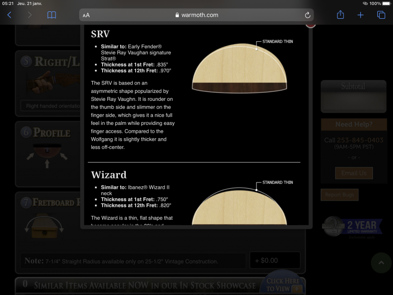 Pareil pour le profile qui est exactement le profile thin de chez Warmoth, je sens que j’aimerais un peu plus épais mais pas trop, je choisis donc de prendre le profile 59. Le SRV me tente mais comme je ne joue que assis, la paume ne seras pas à la même position que lorsqu’on joue debout alors je ne prends pas le risque..