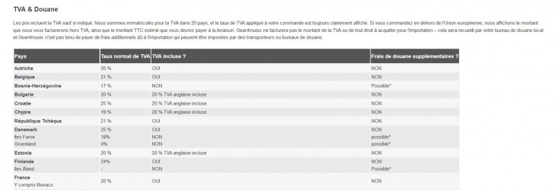La plupart des marchands de musique dans la CE inclut d'office une TVA de 20%. ( Thomann, Gear4Music, ... )