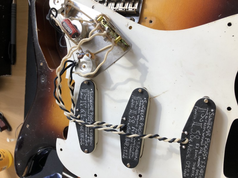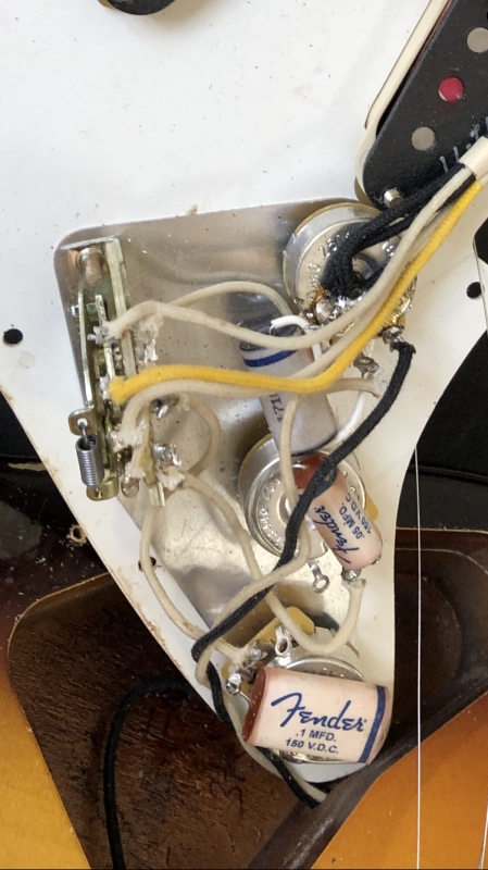 1 pio en 0,1 mfd pour le manche (et middle selon le cablage) et 1 en 0,05 (les cornell rond monté sur les télés) pour le bridge (et le middle selon le cablage)
