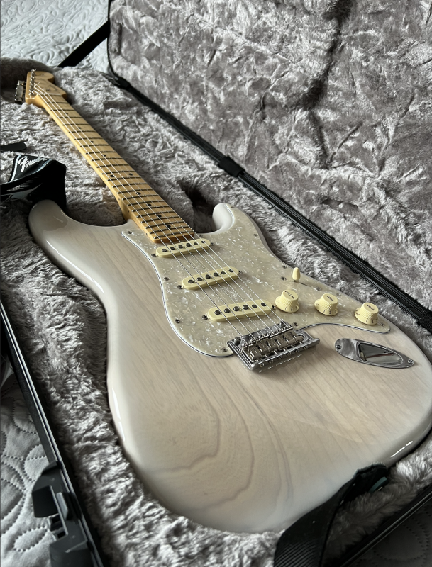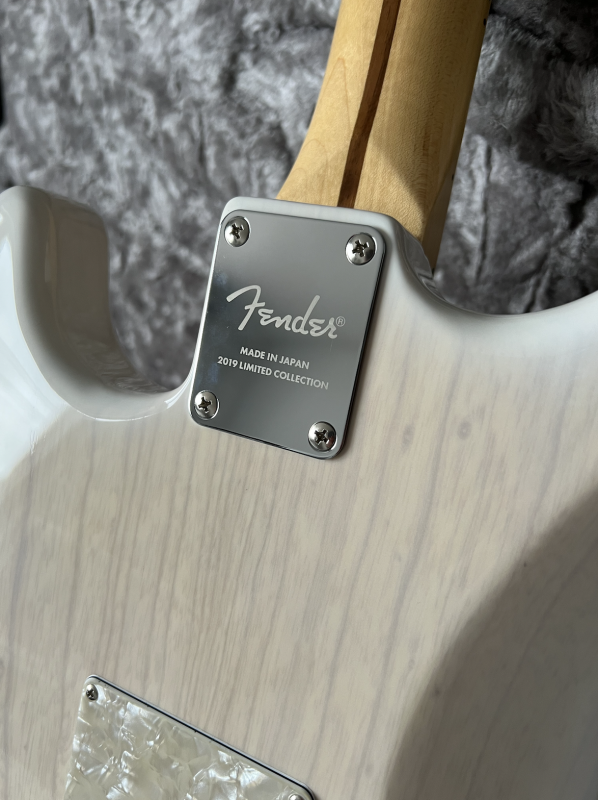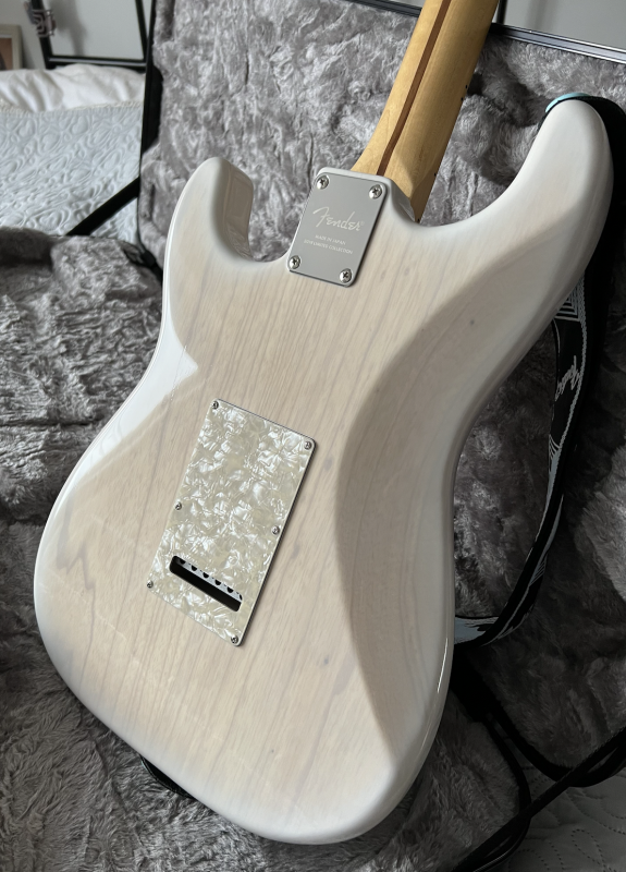 Il s'agit d'une Fender Japan (des productions récentes avec le serial number derrière la tête, comme la plupart des autres Fender) Limited Collection 2019 en White Blonde, teinte du plus bel effet qui laisse transparaitre les veines des 2 parties du corps en frêne (ça devient rare) et aposée de manière plus intense sur les cotes du corps.