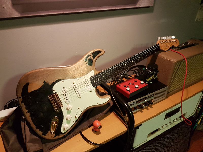 J'ai acheté 85% de la guitare d'occaz. Le corps est soit disant un Monster Relic (Aulne 2 pièces) mais la partie peinte en noire a été appliqué à la main et ne fait pas vernis. C'est une sorte de peinture (gouache ...?). Je vais le refaire, j'ai acheté une bombe de nitro noire. Sinon le reste du corps est sympa (la partie bois nu).