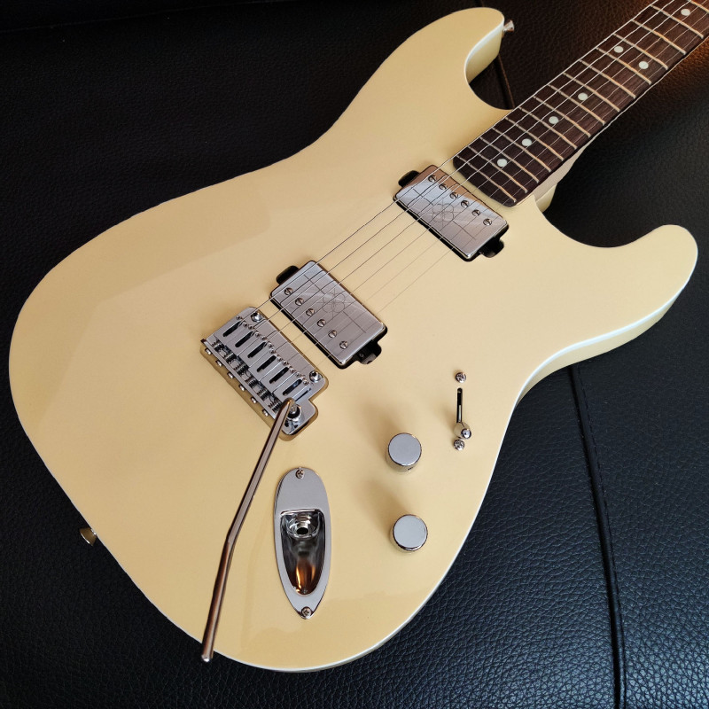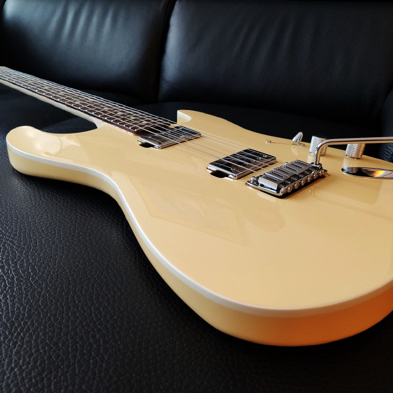 Les micros sont des humbuckers custom pour ce modèle, qui est en fait le modèle signature de la guitariste lead du groupe japonais Scandal, Mami Sasazaki. En tant que tel, je craignais un peu que le manche soit adapté à de petites mains mais en fait, sans être un "gros" manche, il n'est certainement pas un manche fin du tout et tombe très bien dans mes grosses pattes! Quant aux micros, ils me surprennent: du fait du tirant d'arrivée 9-42 et du vibrato flottant, je ne m'attendais pas à ce qu'ils aient à la fois une telle pêche , un tel sustain et un tel corps! Le micro chevalet (12.4) est un plus hot qu'un PAF mais pas non plus trop gras, avec une bosse dans les mediums qui me fait penser au son des micros EVH, tandis que le micro manche a un plus faible niveau de sortie (8.2) qui le rend idéal pour des cleans très fendériens, avec des contrôles de volume et tonalité hyper bien dosés permettant beaucoup de variations.