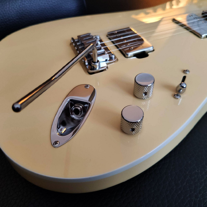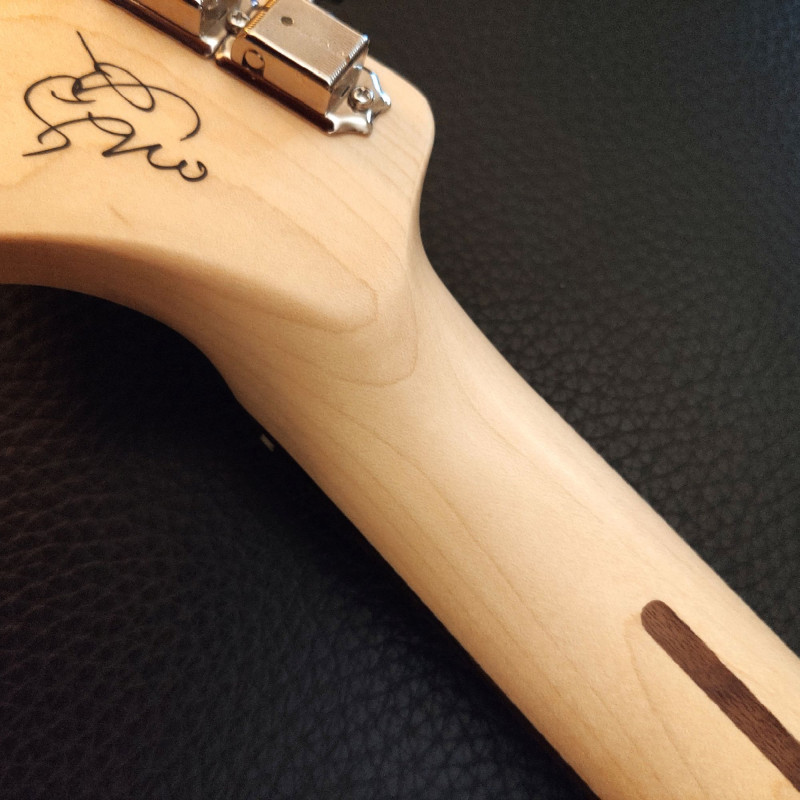 Le corps, avec sa table légèrement bombée, est hyper confortable avec des chanfreins parfaitement étudiés et un joli filet qui souligne les courbes. Le vibrato est un Gotoh 510T-FE1, réglé flottant, et tient très bien l'accord.