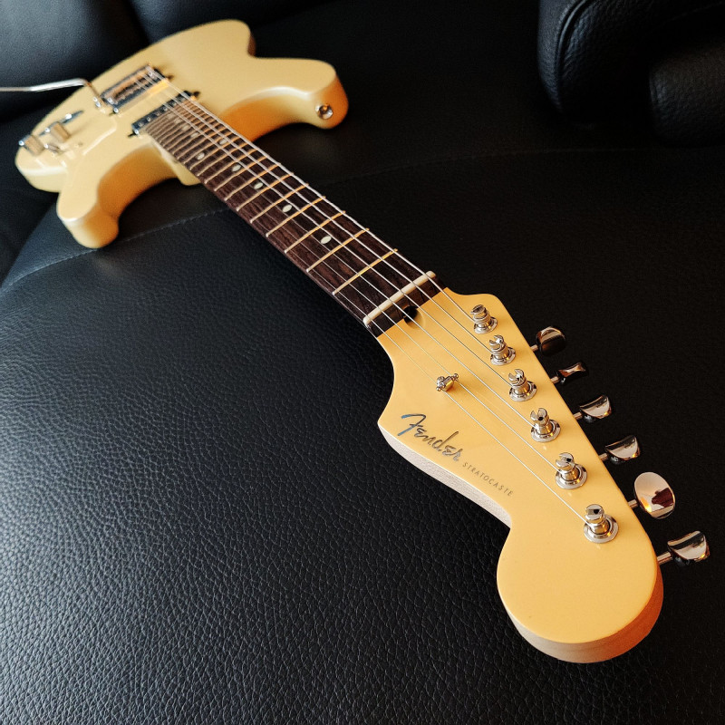 A savoir cette superbe Fender Stratocaster "Omochi" made in Japan. Corps en aune, touche en (superbe) palissandre.