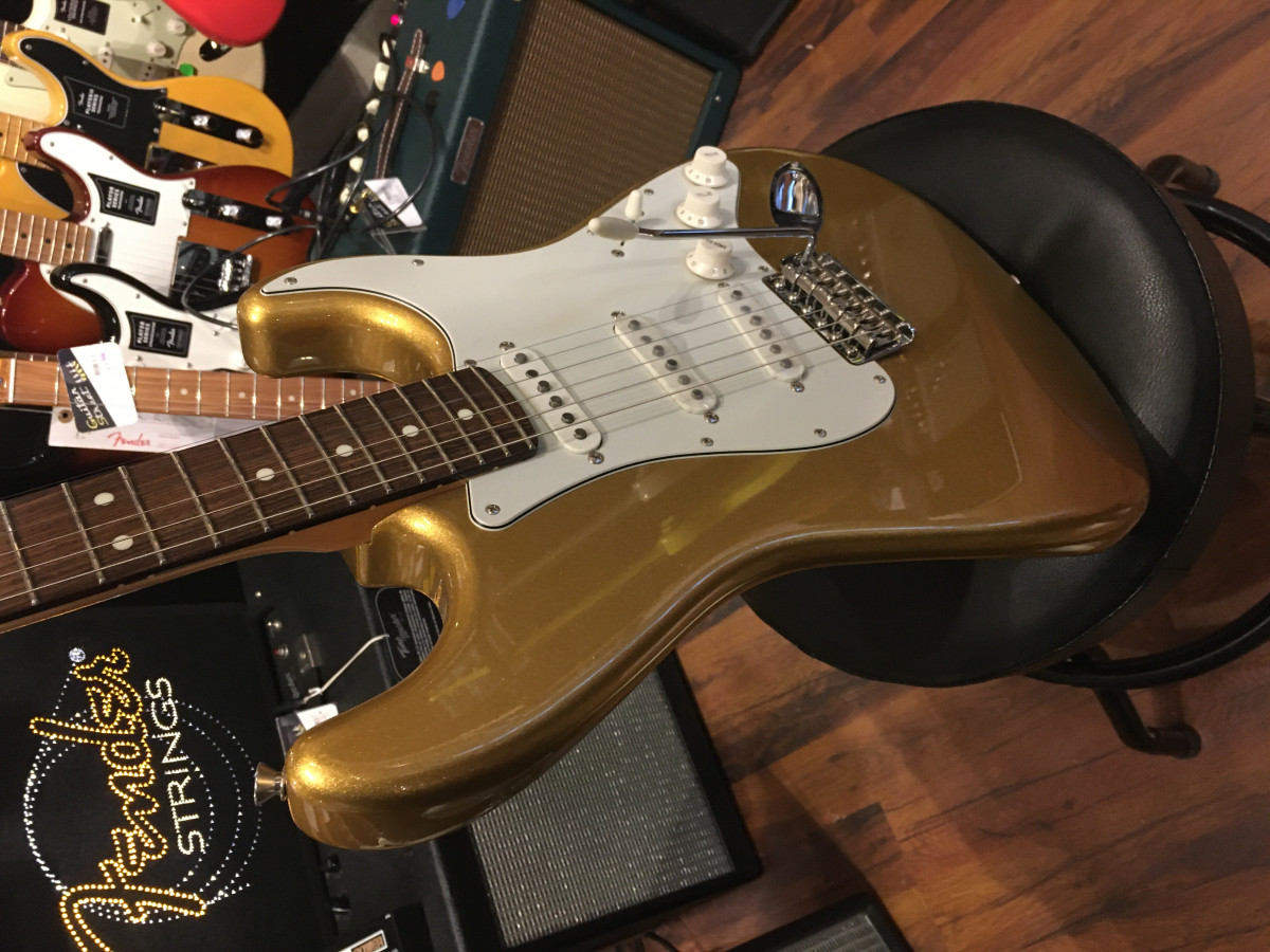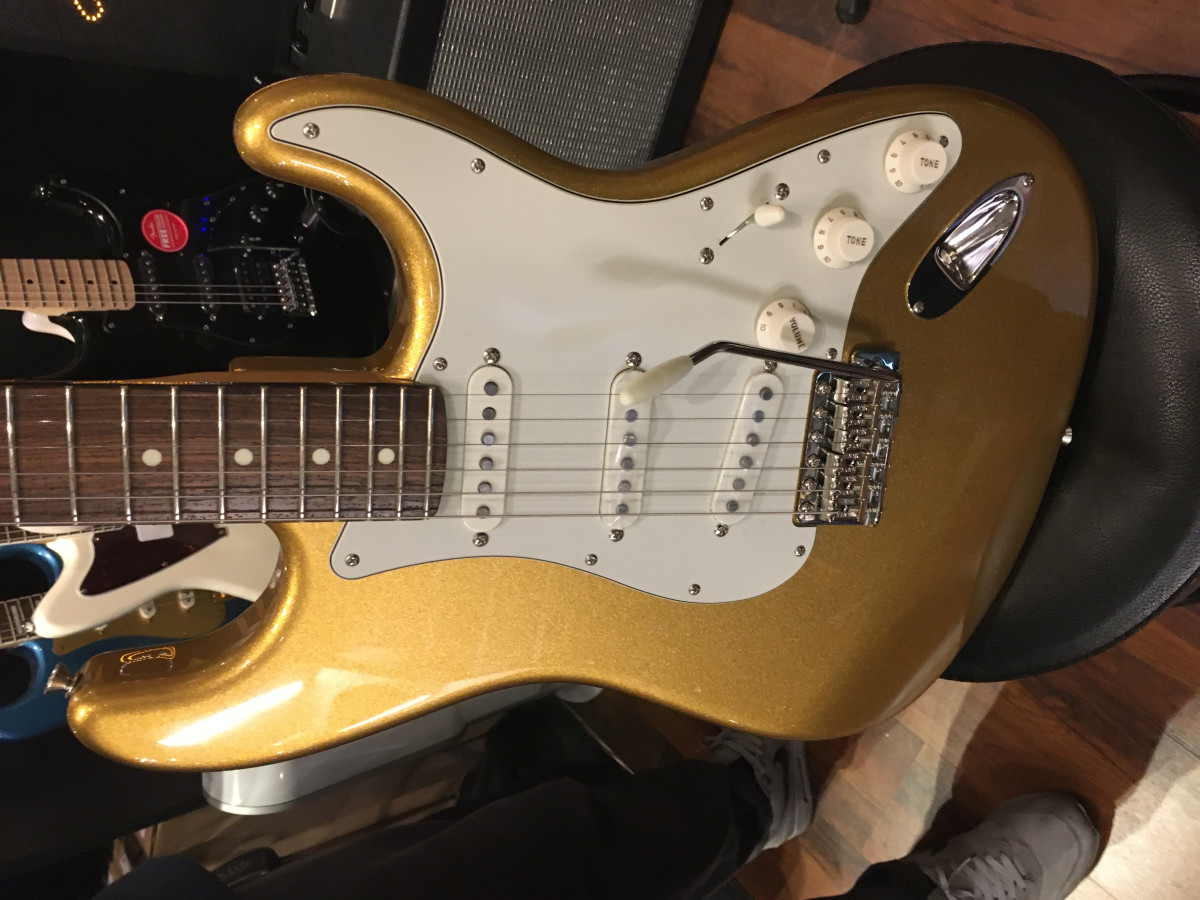 J’ai essayé en magasin, par hasard, parce qu’elle m’avait tapé dans l’œil une Stratocaster Japan hybrid 2, finitions « MYSTIC AZTEC GOLD »,