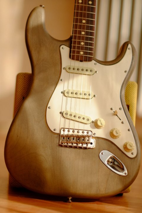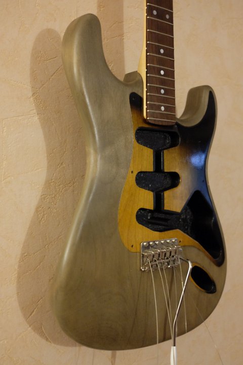 Et comme je devais me faire la main pour la prochaine qui sera une sunburst, je me suis entraîné sur celle là, sous la plaque, à faire un vernis complet. Dans le genre, vernis usé partout sauf sous la plaque. Ça n'a pas vocation à être réaliste :