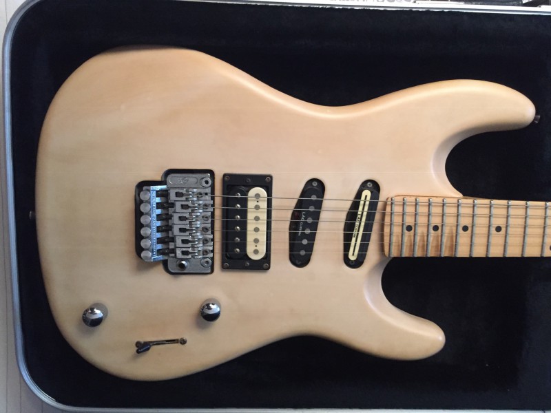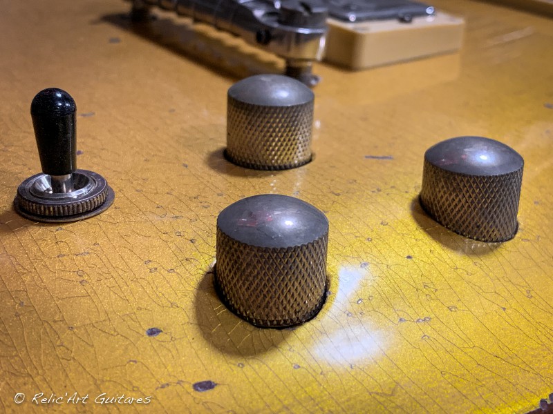 Pour rappel, il s'agit d'une Master RF1000, vendue comme ayant une table flammée (au catalogue), alors qu'en fait il ne s'agissait que d'un placage. Michaël, lors de notre entrevue, avait un doute au sujet de la table massive, et son doute s'est confirmé au décapage. Nous sommes donc parti sur un goldtop et un léger relic avec faïençage, après qu'il ait oté le placage.
