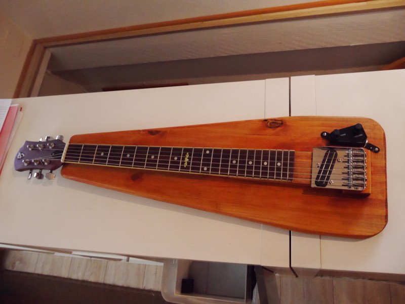 J'ai remplacé le P90 chevalet par un mini humbucker histoire d'avoir un peu plus de patate. Il sera à vendre dans peu de temps je pense car j'ai bricolé la vieille guitare de mon père : Elle prenait la poussière, et l'ayant construite lui-même il y a une quarantaine d'années, il n'y a pas de truss-rod. Du coup le manche est bien vrillé, impossible à jouer hormis en slide.