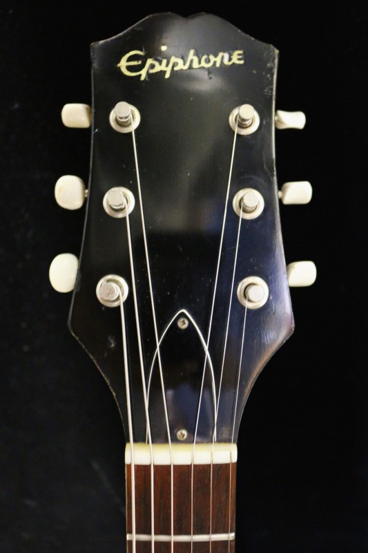 open book étroit. Selon les modèles, elle figure sur les Casino, les Sheraton, les Sorrento, les Century… jusqu’en 1961/62 ou 63. Là encore, cette tête n’est pas une création Gibson. C’est même LA tête historique Epiphone. Celle des Triumph, Zenith, Spartan… des années 1930. Pour les modèles bon marché, elle peut porter depuis les années 30 une plaque métallique estampée blanche en forme de V (de slip !) sur laquelle se trouve le logo de la marque jusqu’en 61/62. C’est le cas notamment sur les Sorrento et les Century.
