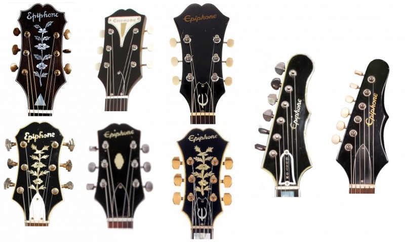 Chacune de ces formes de tête pourra recevoir une typographie du logo et un décor d’inlay différents selon l’année, la place du modèle dans la gamme. Ainsi, la tête de la Sheraton ou de l’Emperor  sera la plus chargée, quand celle de la Casino ne porte que le logo incrusté. Au-delà de ces quatre types, il faudrait ajouter les types marginaux, qui sont légions chez Epiphone, comme la tête quasi droite de l’Olympic.