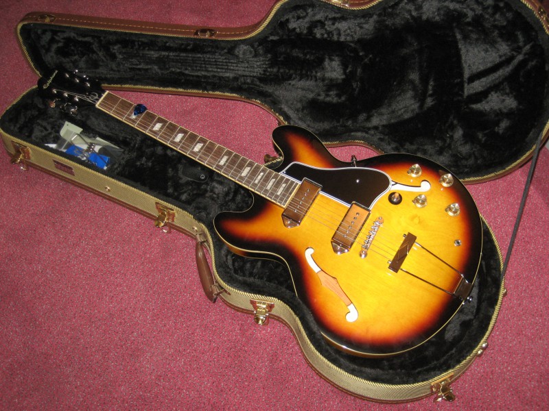 Essai rapide: on sent la guitare "bien née", qui sonne tout de suite tant à vide que branchée - faut pas commencer à chercher ses réglages. Et oui, les micros sont infiniment plus fidèles à ce qu'ils doivent être sur une Epi reissue que les précédents - y'a pas photo. Ils restent (et si jamais ils se décidaient à les vendre séparément ... )