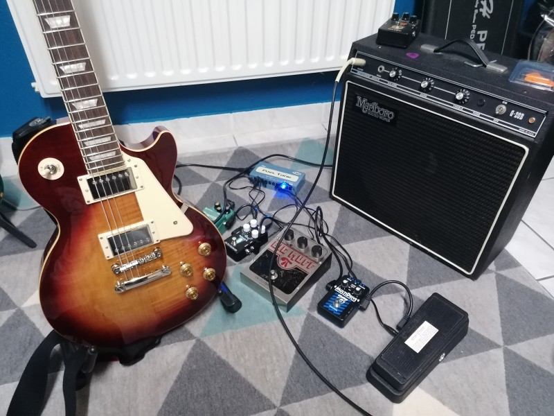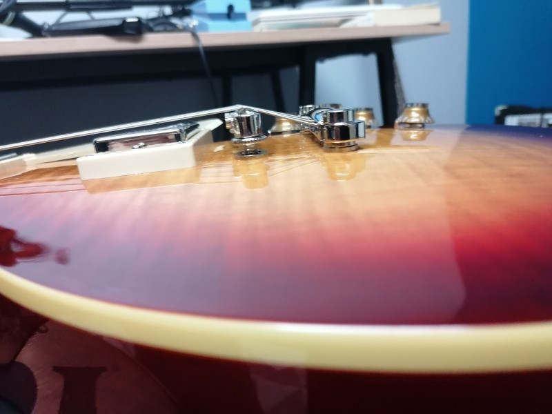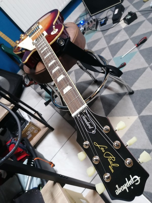 J'ai utilisé, pour la plupart, des pièces de récup que j'avais dans mes bacs de matos : stop bar, tuneOmatic, et mécanique Grover provenant de cette ancienne Epiphone LP standard. Des micros SP custom mini C5 et mini Verstyle que j'adore et que j'avais monté sur ma Edwards LP 54 (LP revendu depuis).