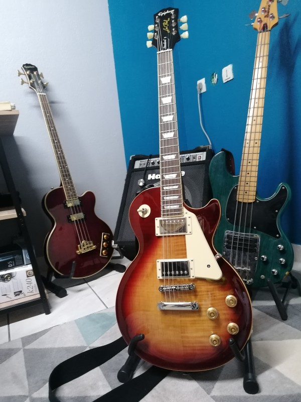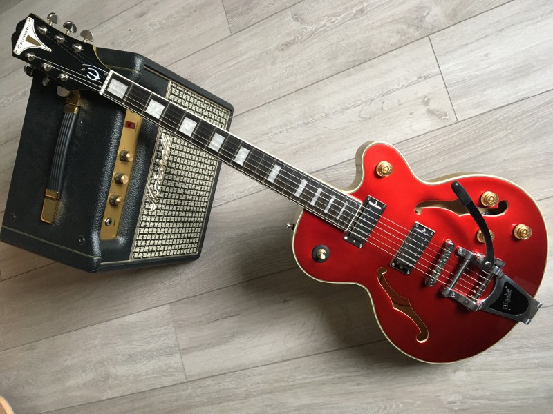 Mon cahier des charges était de posséder un guitare avec un corps de ES (Hollow body) avec des ouïes, des emplacements P90 ou mini humbucker et une teinte gold sur la guitare (pas la version tout gold de la ES Kat Uptown, c'est trop gold). Ceci parce qu'elle complèterai bien mes guitares en humbucker, corps plein ou micros simple en manche erable/rose wood que je possède.