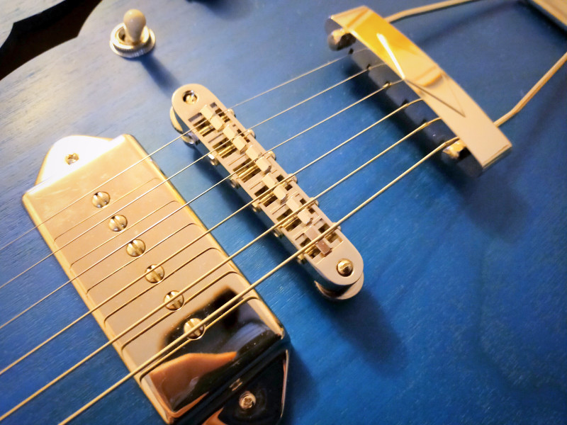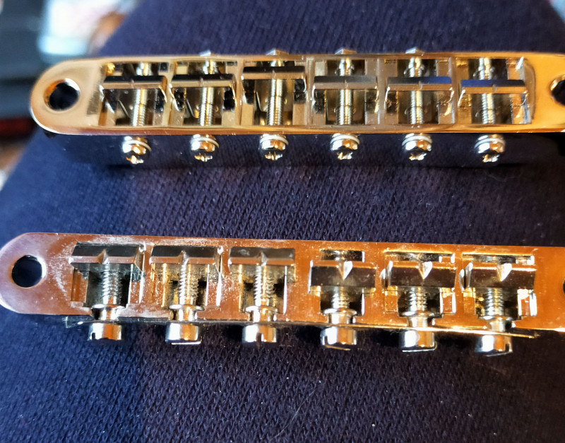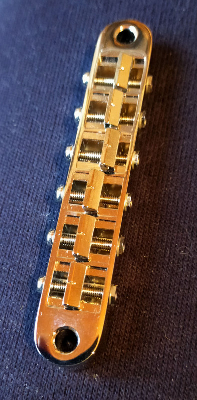 Et remplacement du chevalet B2 epiphone (vraiment inadéquat) par un chevalet Gotoh que j'ai mis à l'envers de façon à pouvoir reculer au maximum le sol pour le régler enfin correctement.