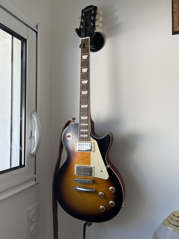 Déjà, je n'aime pas le cordier Epiphone, je trouve que la petite barre qui bloque les vis génère souvent un léger buzz, donc dès réception de la gratte, avant de la tester, je l'ai changé pour un Tonepro, ainsi que le chevalet. Et j'ai changé les cordes au passage.
