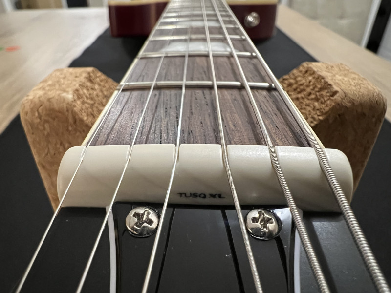 Par contre, elle est arrivée avec un sillet dans un état deplorable par contre. Thotho m’as proposé un échange, mais sachant qu’elle sonnait et résonnait très bien, j’ai préféré demander un geste commerciale, et j’ai obtenu 60€. J’ai donc remplacé le sillet par un Tusq Xl à moins de 20€…