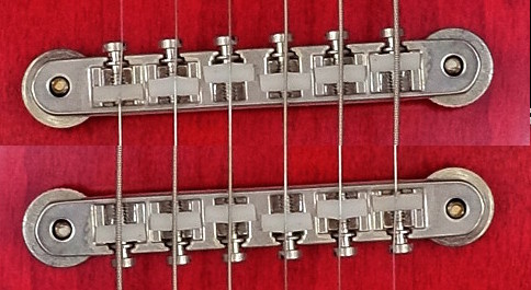Ensuite, le problème sur ma guitare une fois l'ABR retourné, est qu'avec l'angle dû à mon Bigsby, les cordes touchent les vis. Alors ce ne sera peut-être pas le cas sur une guitare avec TOM, car cet angle peut être modifié en rehaussant le TOM, mais avec le risque de déchausser une corde de son pontet si l'on attaque trop fort...