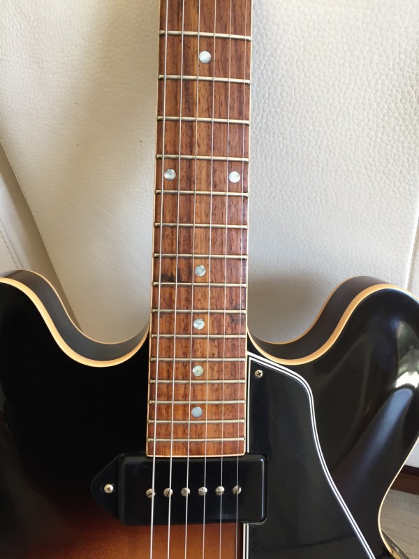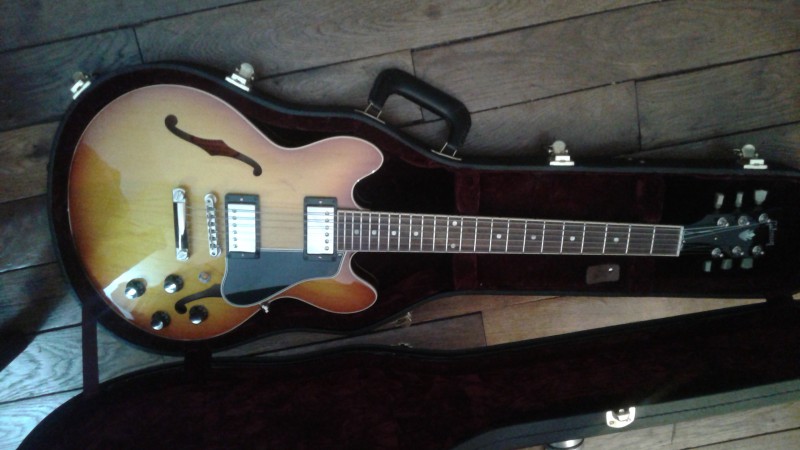 Le son maintenant. J'avais pris avec moi ma Casino Matsu, pour avoir quelques repères. Le son est bon, épais, riche. Je suis étonné par ces micros soit disant "underwound", je les ai trouvé plutôt puissants et mediums (trop ?). Le son de la Matsu joue sans problème dans la même cours, mais il est plus bright, plus Twang. Je pense que l'épaisseur du manche y est pour beaucoup. Après , c'est une question de goût...J'aime bien les deux en fait...
