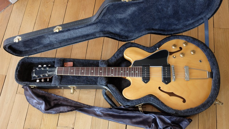 C'est une poutre. C'est la même construction et la même finition qu'une ES-355, le modèle qui s'en rapproche le plus, si ce n'est le profil du manche que je n'ai pas essayé sur une 355. J'adore la nacre et ses reflets colorés en fonction de l'angle où l'on regarde les repères, le parallélogramme éclaté, etc et les effets de binding. Le son, j'imagine, doit être très comparable à celui d'une 339, le feeling pas forcément du fait de la touche en ébène.