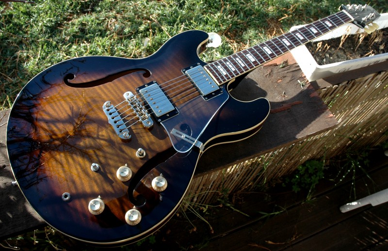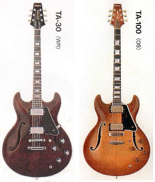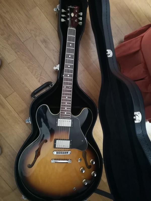 J'aime bien cette marque parce que la première bonne guitare que j'ai eue était une Aria Pro II, après deux épouvantables et très vagues copies de Strat/Tele. J'avais enfin l'impression d'avoir une "vraie" guitare et en plus, c'était une copie de la guitare de mes rêves, l'ES335, donc gros kiff. Par rapport à l'ES 335 ou l'autre Aria Pro II postée sur cette page, elle a quand même quelques différences notables. Elle appartient à la série TA (Titan Artist), apparue au début des années 80, plus petite de caisse et de forme sensiblement différente. Il y a quelques mois j'ai retrouvé exactement la même que celle que j'avais eue quand j'étais jeune et beau. C'est une jolie petite guitare tout à fait agréable à jouer, mais on reste en-dessous de ce que peut offrir par exemple une Sheraton. Une vraie 335, je n'en parle même pas.