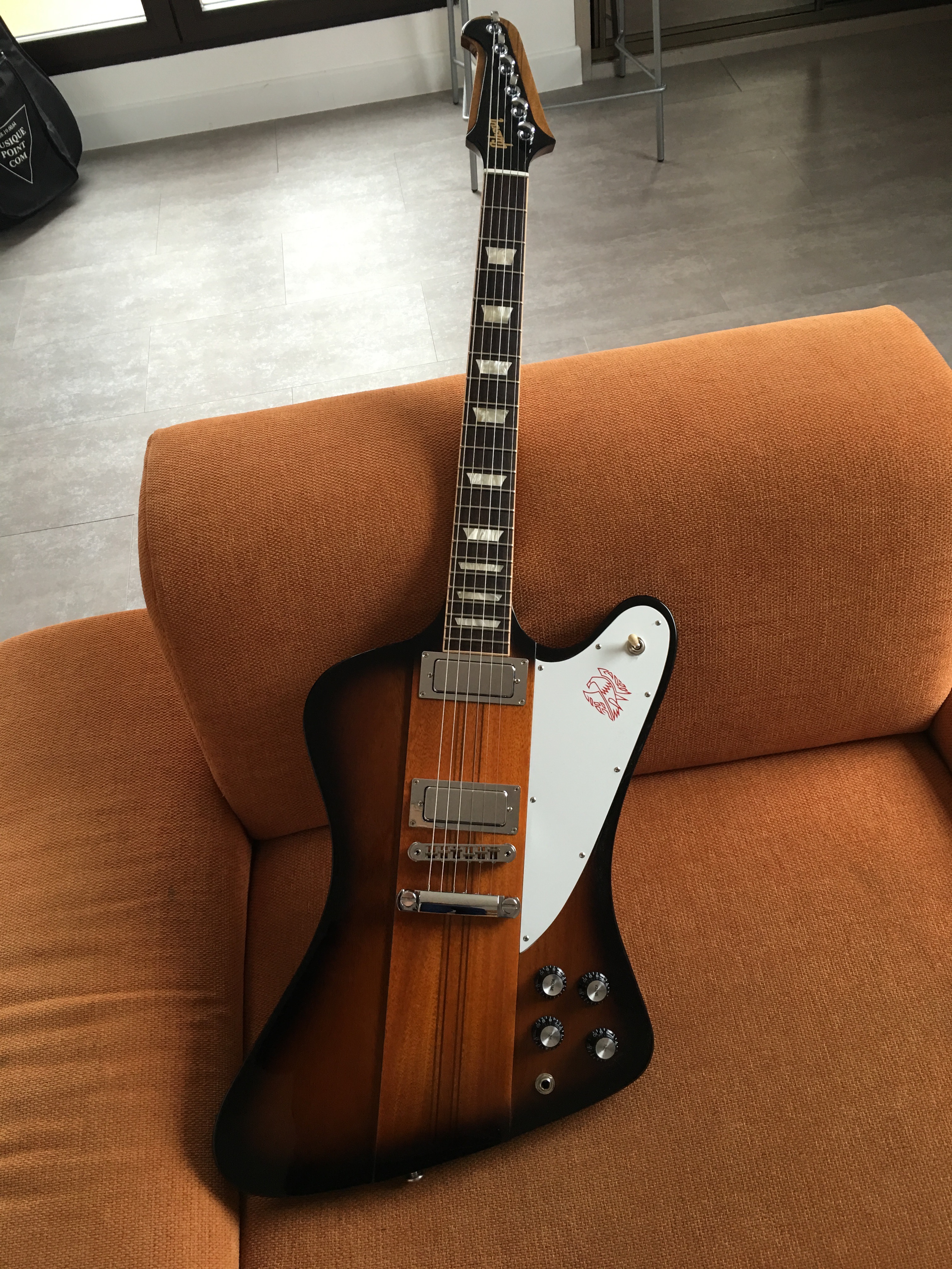 Bon j'ai reçu ma Firebird reversed (modèle classique) sunburst il y a une semaine. Deux ans que je bave sur ces guitares et enfin... le bon plan en solde. Pas donné d'avis tout de suite car sur le coup on est nécessairement toujours hyper emballé. J'attendais le test de la répét avec le groupe.