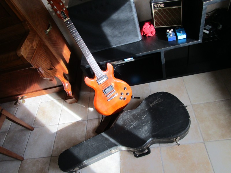 Alors voici la guitare  dont un ami à moi (non guitariste) a hérité et m'a prêté afin que je la remette en état et qu'elle sorte un peu de son étui qu'elle n'a plus quitté depuis une dizaine d'années.