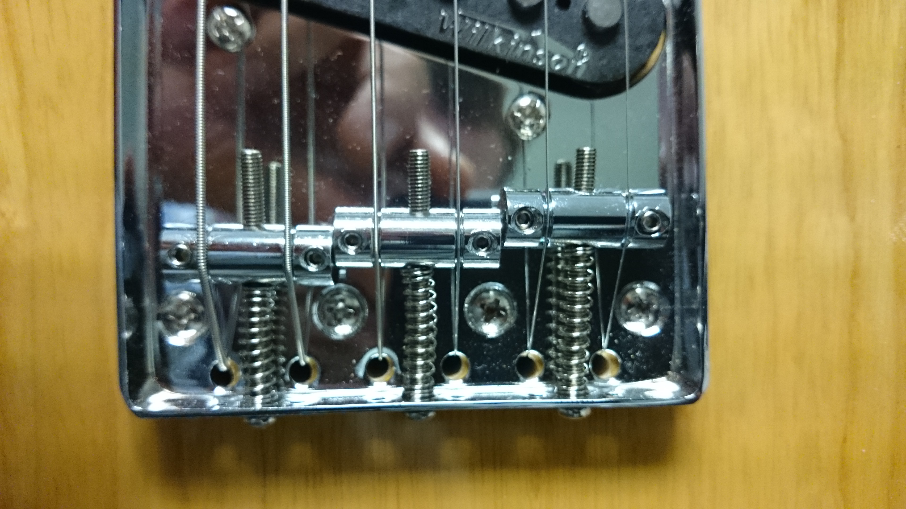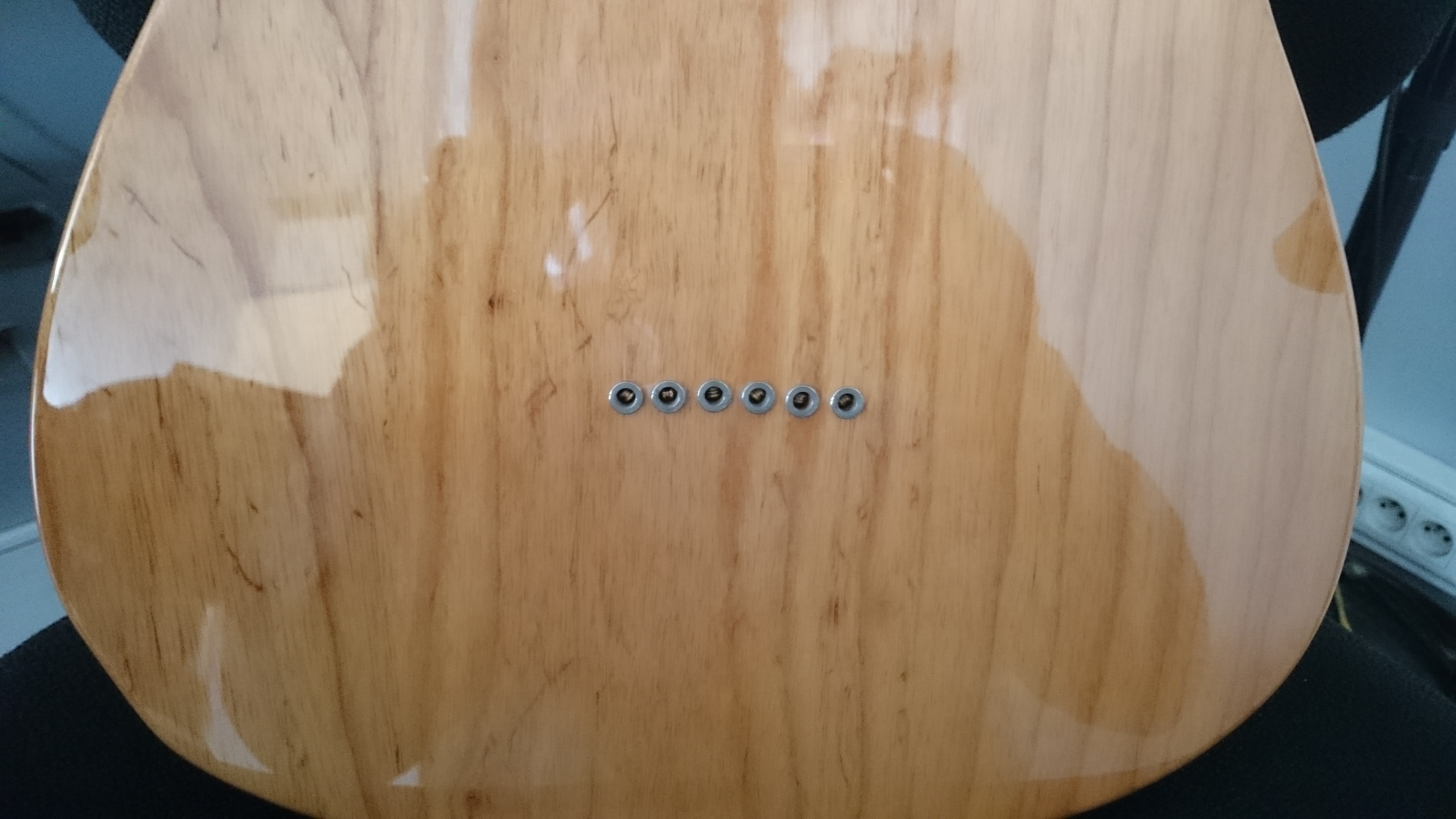 et les bois sont de toute beauté : dos en une seule pièce d'acajou apparemment, car j'ai eu beau chercher, je n'ai pas vu la moindre jonction entre 2 pièces ! La table en érable pommelé est très jolie, le rouge assez sombre. Les binding de couleur ivoire sont nickels, aucune rayure, les cordes sont parfaitement alignées. Le manche est recouvert au dos, d'un vernis satiné très doux, l'érable est très beau, sans nœud ou tâche bizarre, les frettes ne sont pas oxydées il n'y a que leurs bords qui seront peut-être à adoucir un tout petit peu (c'est le seul "défaut" que j'ai constaté). Le palissandre est homogène, bien sombre, bref très beau aussi ! Les cordes ne sont même pas oxydées ! Je n'ai pas encore pu la brancher...je vais donc personnaliser un peu les réglages et revenir après le test sonore fait...bien que je ne connaisse absolument pas les P90 !