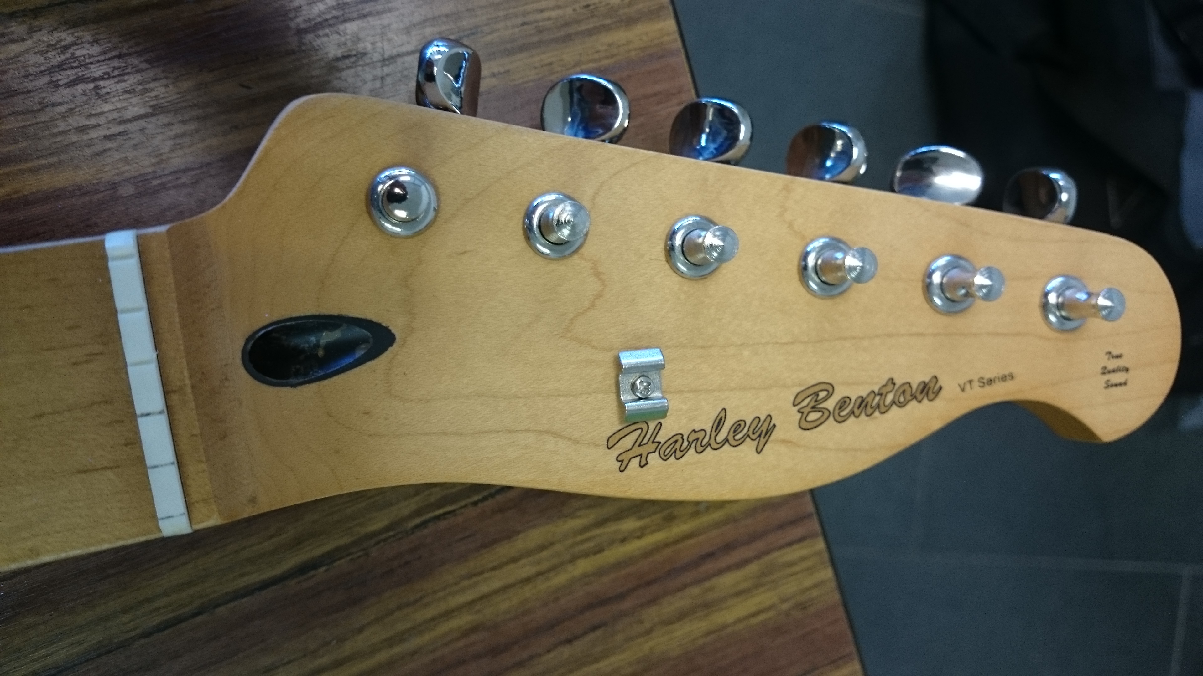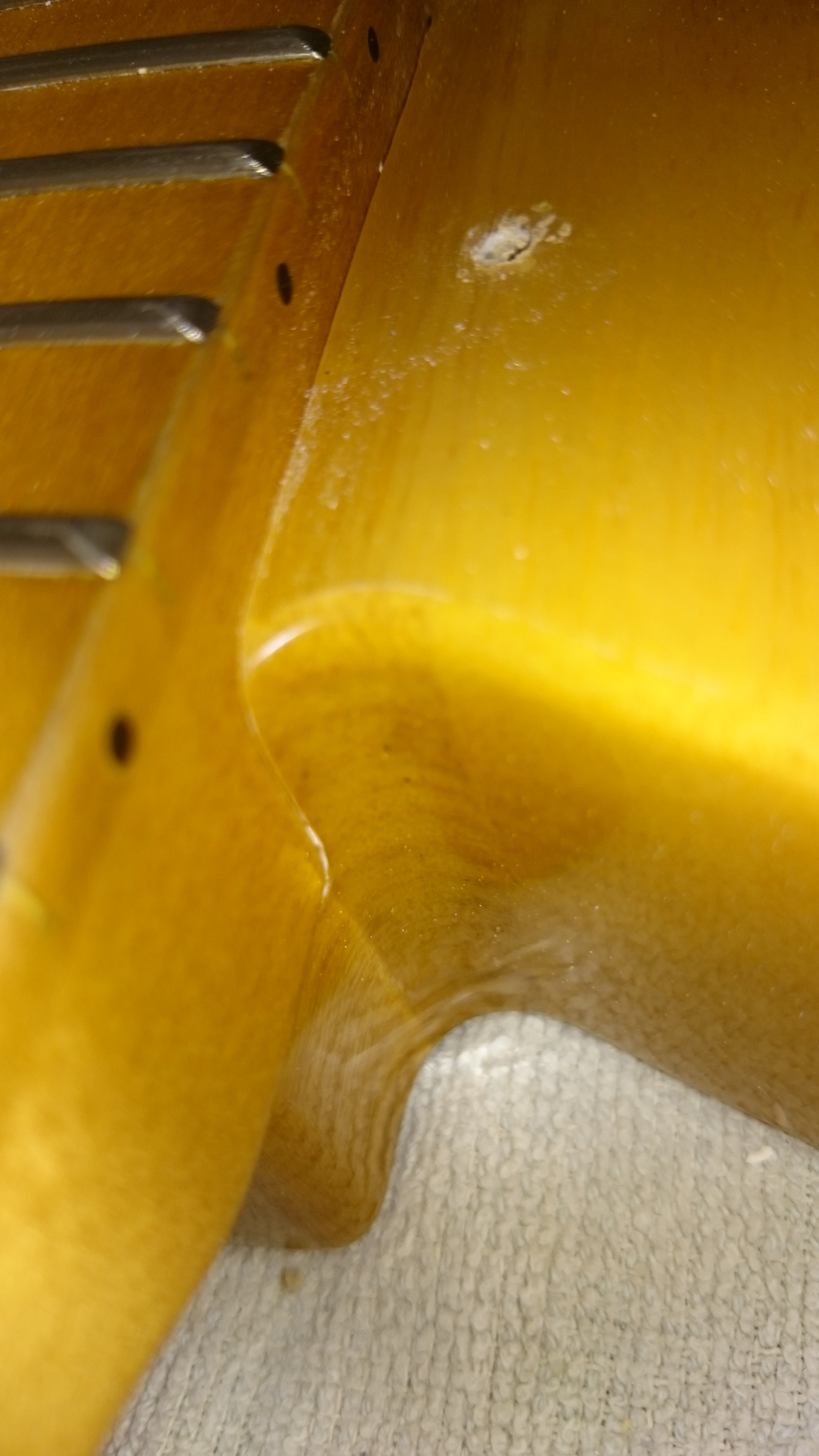 et le défaut principal de la guitare, le chevalet mal aligné sur les trous des cordes.