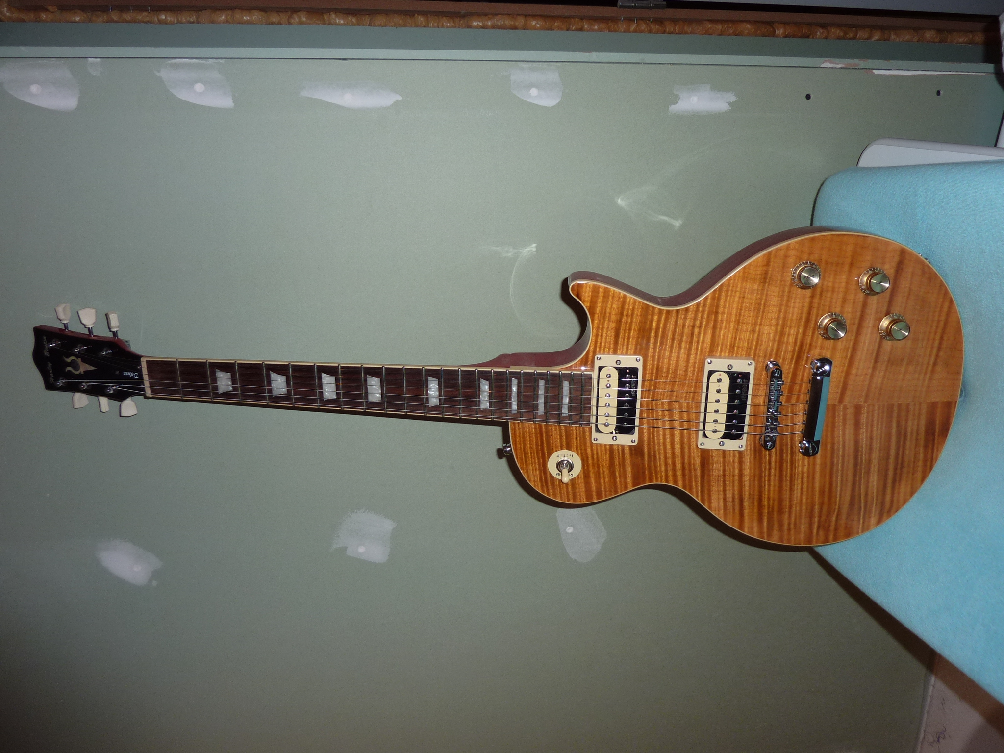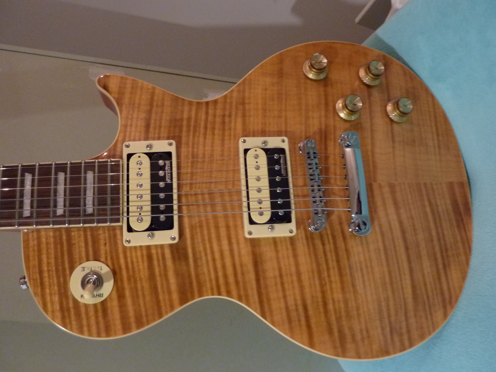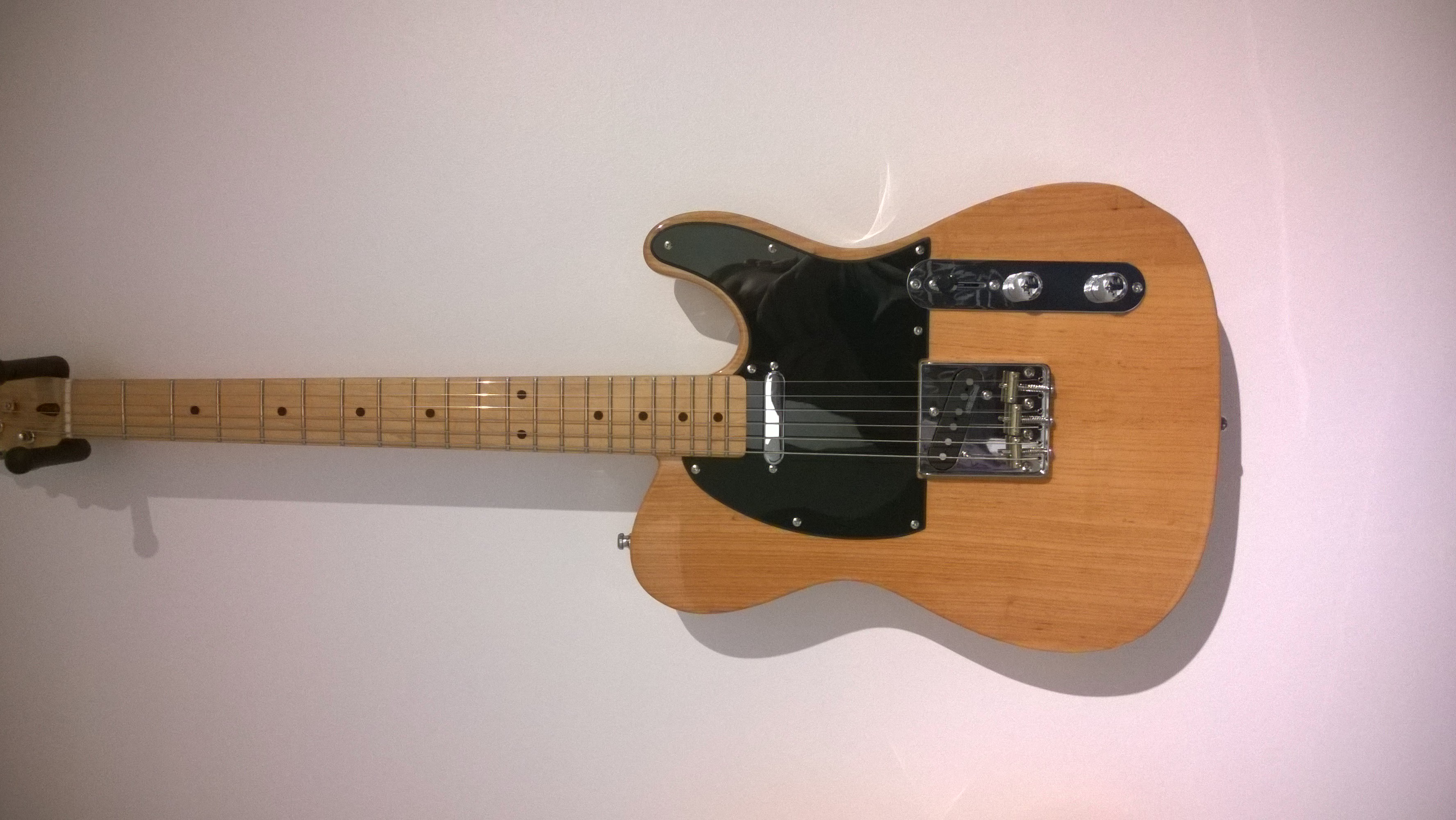 J'ai pas trop eu le temps de la tester, ce sera pour demain. Corps en 3 morceaux, manche satiné (j'ai d'ailleurs l'impression que la touche n'est pas vernis), mécanique style moderne (sans le trou du dessus).