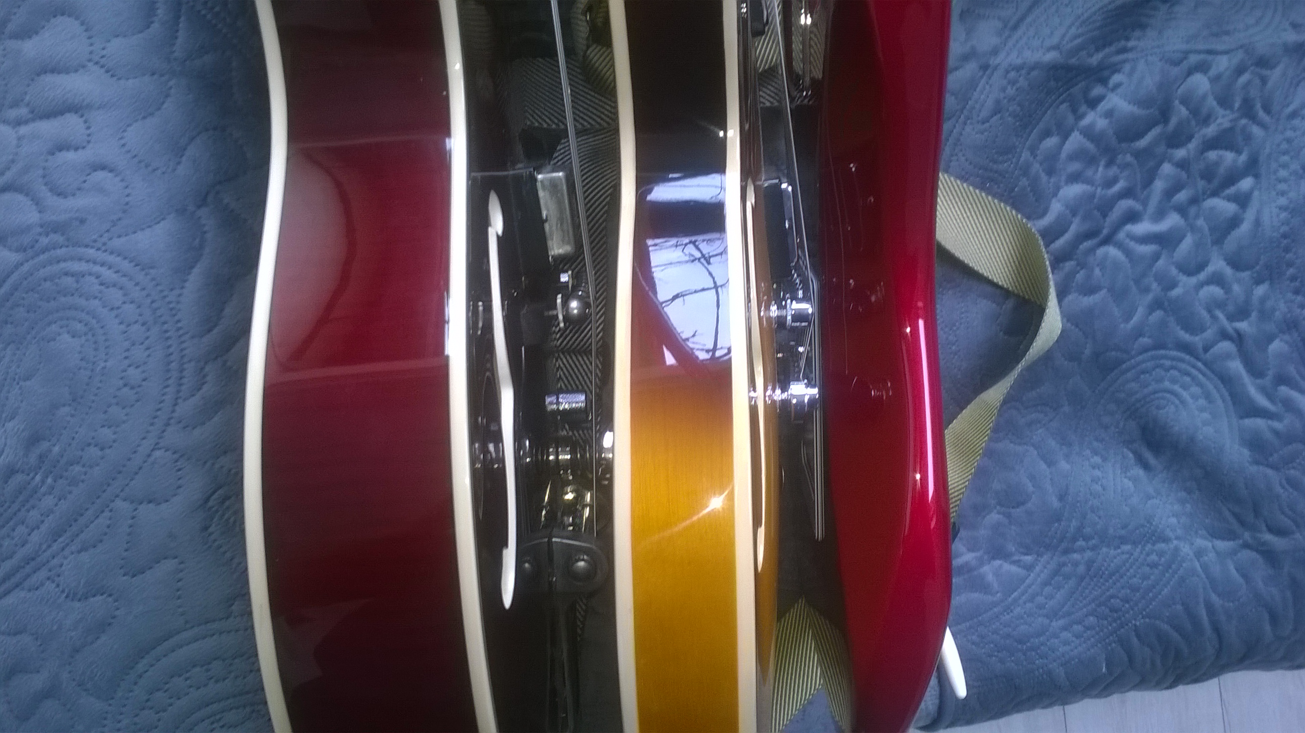 On se rend bien compte que la caisse est plus grande, mais comme les eclisses ne sont pas plus hautes que les bords de la LP je n'ai pas du tout l'impression d'encombrement que j'ai par ex avec ma Swingster (type Gretsch) qui pese pareil mais un peu plus grande et surtout plus epaisse.