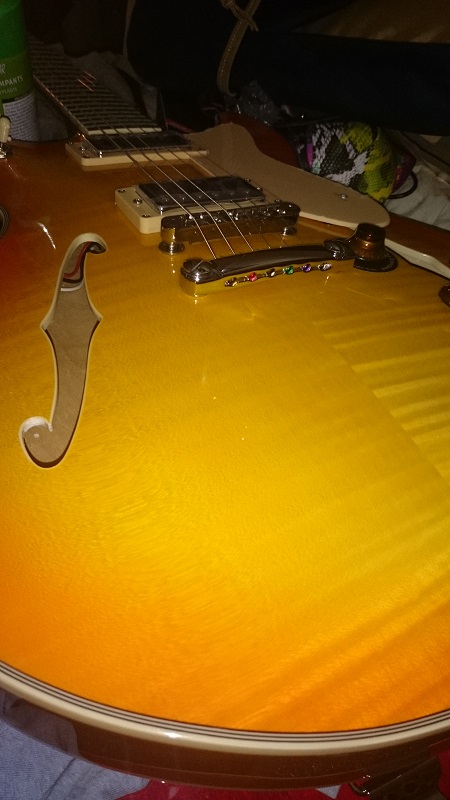 Aucun défaut de finition, absolument aucun, aussi minime soit-il! Binding parfait, frettes nickel, action impec, vraiment rien à redire! Et légère: 3760g (en fait, impression de légéreté seulement, la Casino Coupe ne pèse que 2780g, 1Kg de moins!)