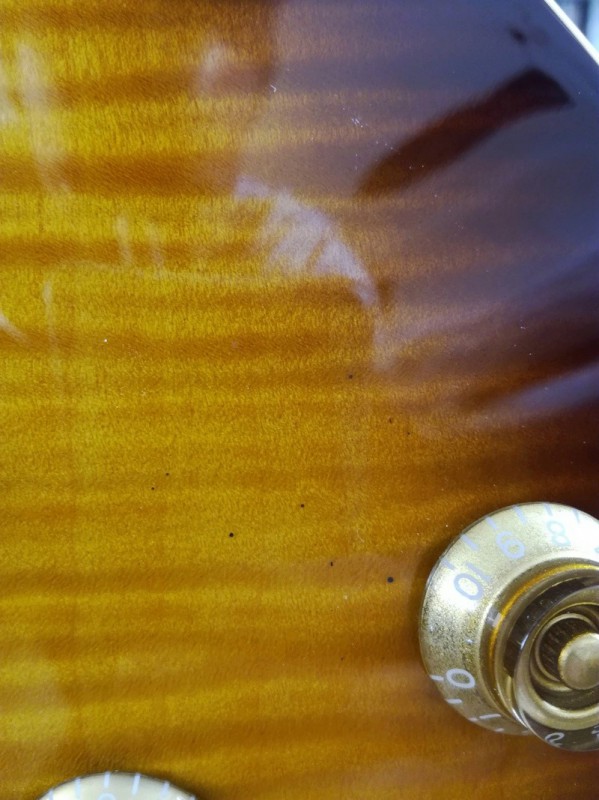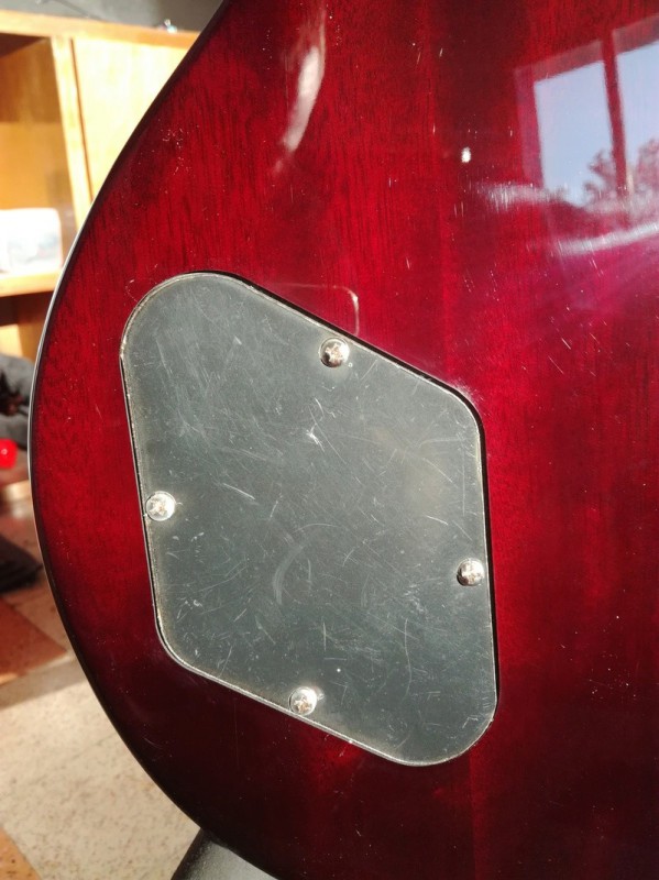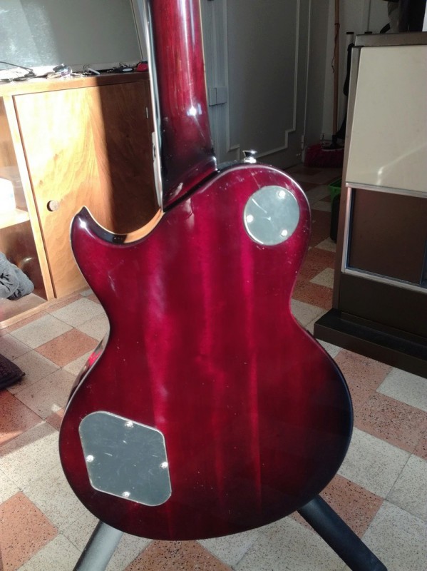 Quelques (très) petites imperfections cependant : les mécaniques ne sont pas toutes alignées et les deux dernières sont vraiment basses, il s'en faut de peu que les extrémités des platines ne dépassent de la tête. Elles ne portent aucune inscription, malgré le descriptif du site rien n'indique que ce soient des Wilkinson. Elles sont en tout cas fermes et précises. La plaque qui cache l'électronique n'est pas bien ajustée, il y a un petit jour tout autour. Pour finir il y a quelques petits points noirs sur le corps, peut-être des résidus de ponçage, ça n'est pas grand-chose mais ils sont sous le vernis et donc condamnés à rester là. Rien de rédhibitoire donc.